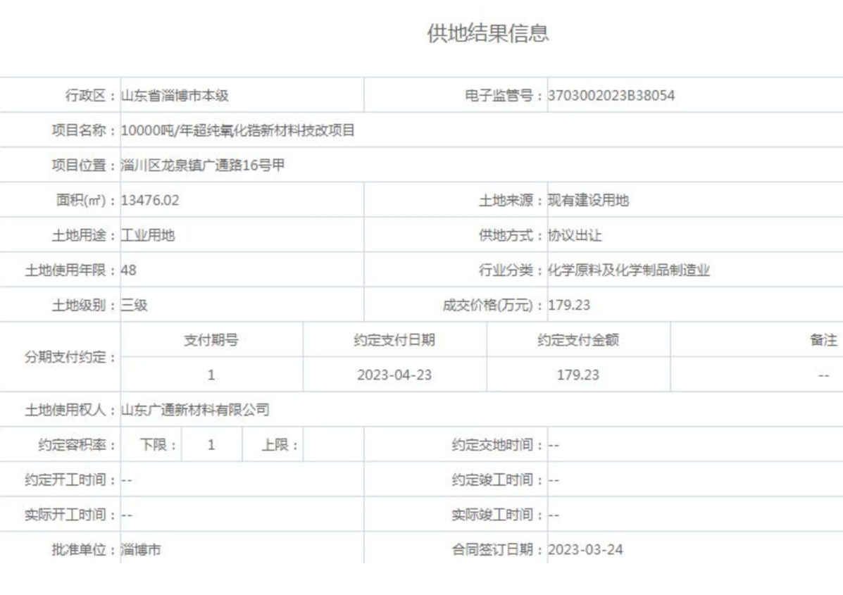 淄博市自然资源和规划局披露的土地出让结果公示显示,2023年3月24日,长裕控股子公司广通新材料通过协议出让的方式获得了两块土地,均位于淄川区龙泉镇广通路16号甲,其中有一块面积为13476.02平方米的工业用地,成交价格仅为179.23万元,显得极不合理。