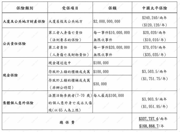 此外,上述方案还包括现金保险和集体个人意外伤害保险。其中,针对法团活动参与者(7-70岁)的个人意外身亡或永久伤残(上限65人),每人保额最高10万港元,对应的保费为1951.95港元/年。业内据此估计,集体个人意外伤害保险总计650万港元需全额赔偿。
