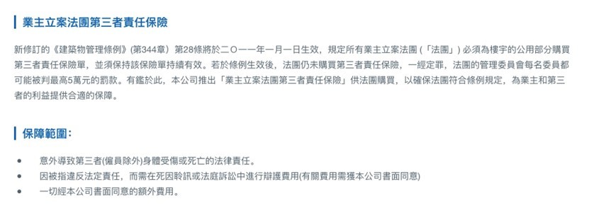 太平保险(香港)业主立案法团第三者责任险保障范围