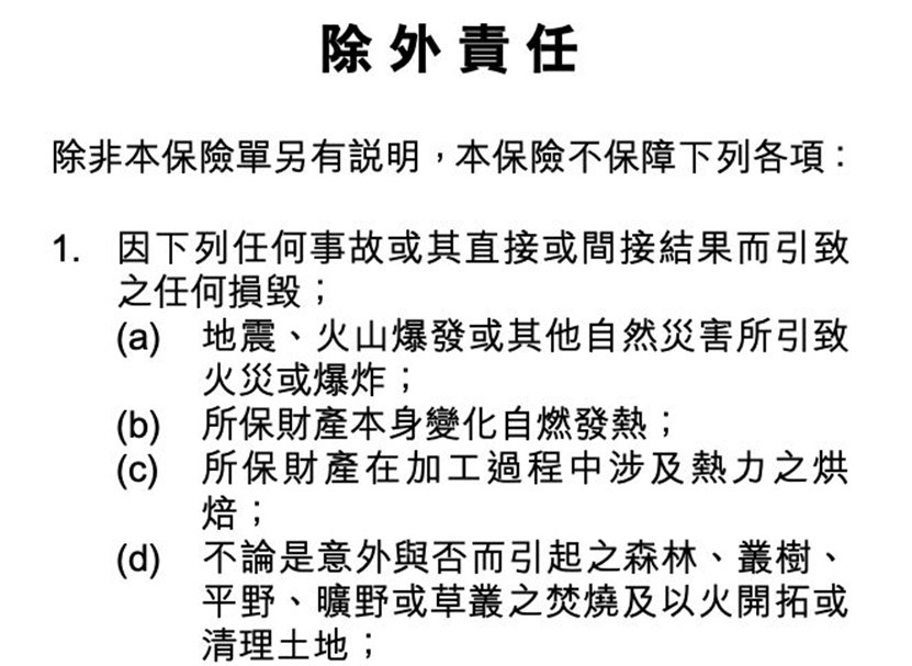 有市场人士认为,“维修期间火灾,火险不保财物损失。”记者查询一款香港本地保险公司的火险条款除外责任,未发现“维修期间火灾不保财物损失”这类除外规定。常见的除外责任包括“地震、火山爆发或其他自然灾害所引致火灾或爆炸”等。
