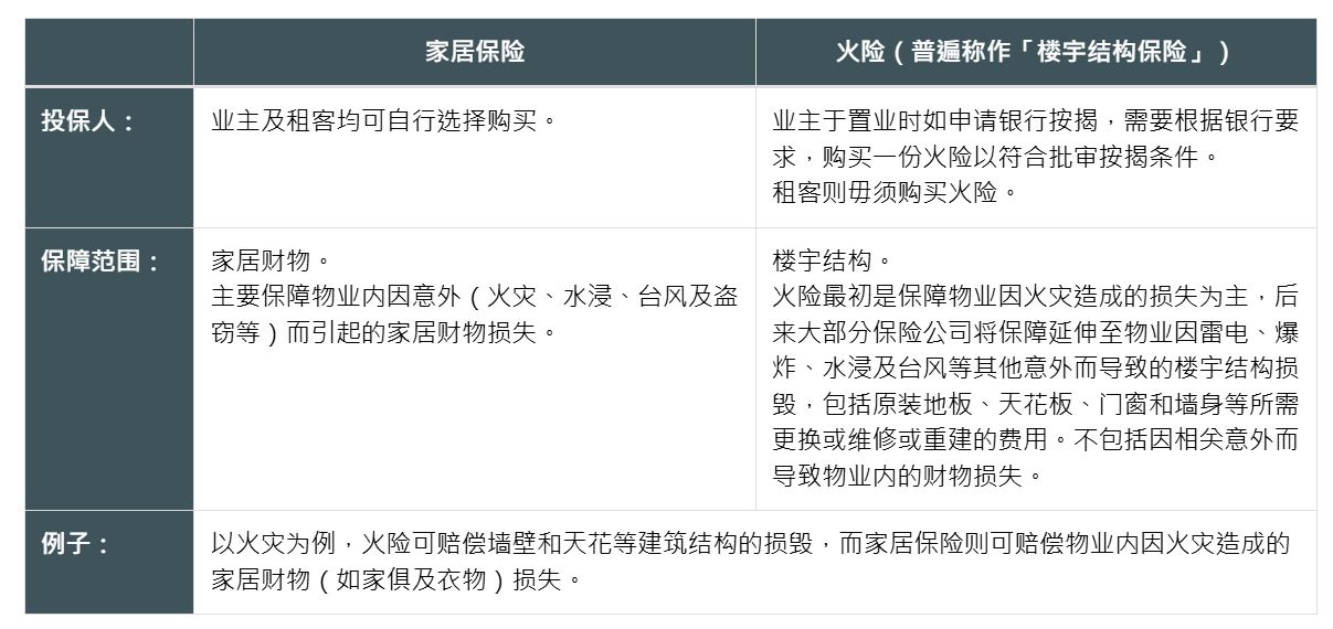 香港保监局曾就家居保险与火险做区分,以火灾为例,火险可赔偿墙壁和天花等建筑结构的损毁,而家居保险则可赔偿物业内因火灾造成的家居财物(如家具及衣物)损失。