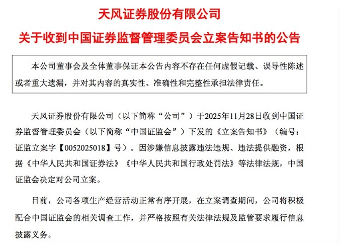 11月28日,天风证券(601162)发布公告称,公司于当日收到中国证券监督管理委员会下发的《立案告知书》。因涉嫌信息披露违法违规及违法提供融资,根据相关法律法规,证监会决定对公司立案调查。