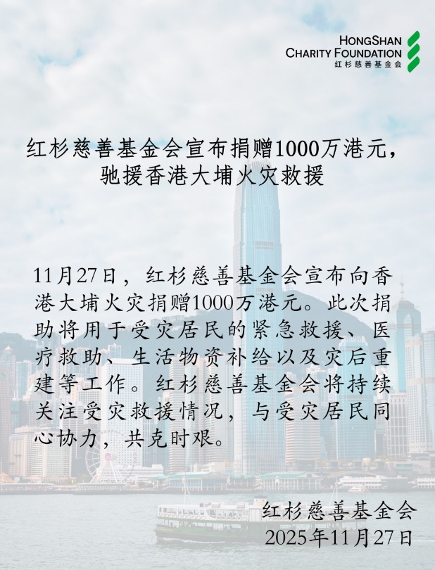 11月27日,红杉慈善基金会宣布向香港大埔火灾捐赠1000万港元。此次捐助将用于受灾居民的紧急救援、医疗救助、生活物资补给以及灾后重建等工作。