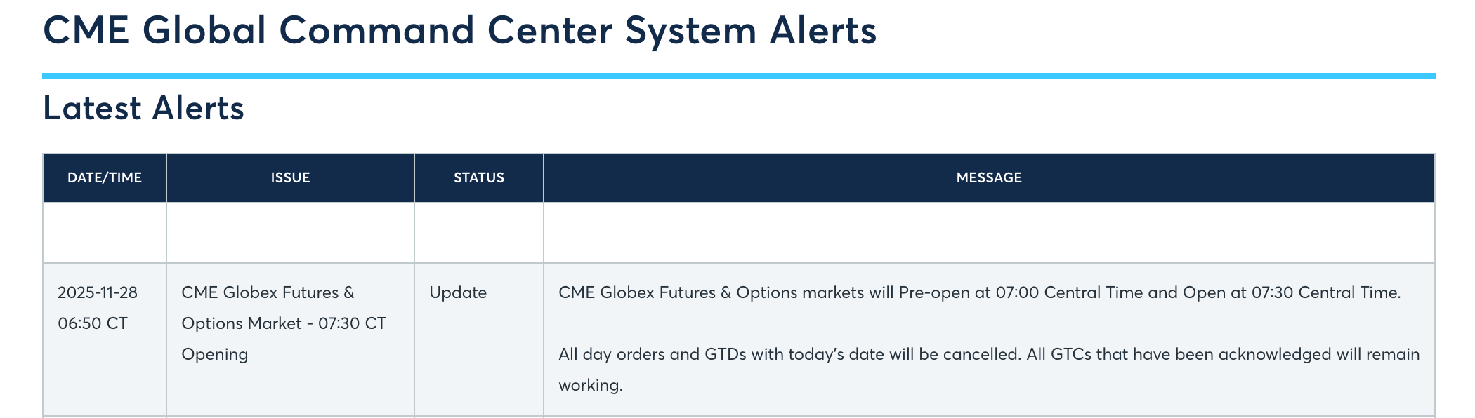 北京时间11月28日晚间,全球最大的衍生品交易所芝加哥商品交易所集团 (CME Group,以下简称“芝商所”)最新公告称,GLOBEX期货和期权市场将于美国中部时间7点30分(北京时间21点30分)开市。