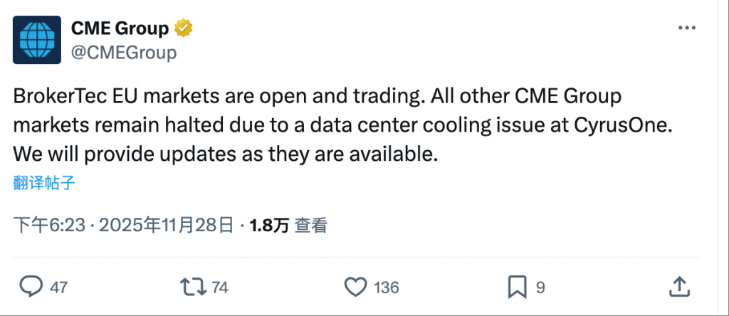 此前,芝商所已公告称,外汇交易平台EBS市场已于11月28日伦敦时间中午12点(北京时间20点)重启。同时,旗下专注于固定收益的Brokertec US Actives和Brokertec EU平台开放,交易进行中,而所有其他市场仍暂停交易。