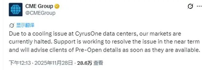 北京时间11月28日下午,交易所运营商芝加哥商品交易所集团(CME Group)公告称,由于CyrusOne数据中心的冷却系统出现问题,衍生品市场暂停交易。芝商所表示,“技术支持部门正努力在短期内解决问题,并将尽快向客户提供开盘前的详细信息。”