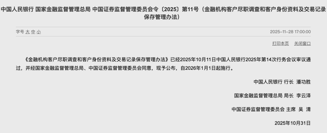 11月28日,中国人民银行、金融监管总局、中国证监会对外发布《金融机构客户尽职调查和客户身份资料及交易记录保存管理办法》(以下简称《管理办法》),落实新修订的反洗钱法要求。