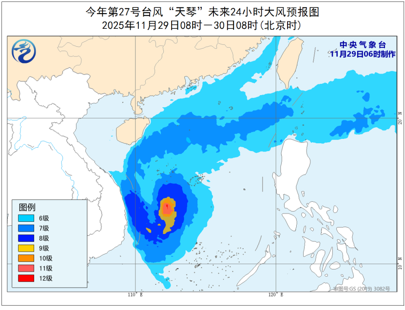 大风预报:29日08时至30日08时,受“天琴”和冷空气的共同影响,台湾海峡、巴士海峡、南海大部及东沙群岛、西沙群岛、南沙群岛西北部海域、福建中部沿海、海南岛东部沿海将有6-8级大风,其中,南海西南部和中西部的部分海域风力可达9级,“天琴”中心经过的附近海域风力可达10-11级,阵风12级。