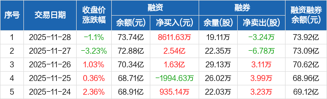 药明康德融资融券信息显示,2025年11月28日融资净买入8611.63万元;融资余额73.74亿元,创历史新高,较前一日增加1.18%