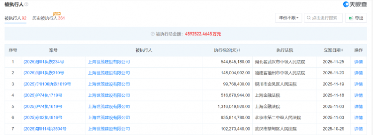 近日,上海世茂建设有限公司新增一则恢复执行信息,执行标的5.4亿元,执行法院为湖北省武汉市中级人民法院,立案日期为11月25日。