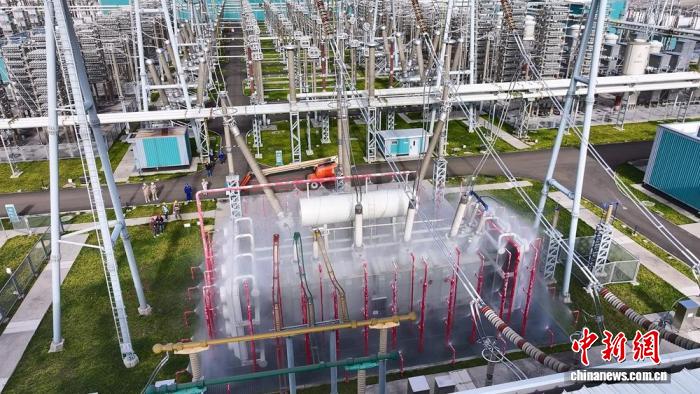 布拖±800千伏特高压换流站500千伏主变压器开展消防喷淋试验现场。郑自豪摄