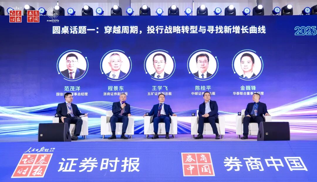 第十九届深圳国际金融博览会暨2025中国金融机构年会日前在深圳举行。在“2025中国证券业投资银行高峰论坛”分论坛上,围绕“穿越周期,投行战略转型与寻找新增长曲线”,浙商证券副总裁程景东、五矿证券副总裁王学飞、中邮证券副总裁陈桂平、华泰联合董事总经理金巍锋、国信证券董事总经理范茂洋(主持人)五位投行专家,展开了一场精彩的圆桌分享。