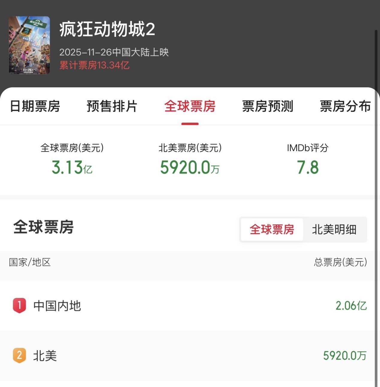 在全球票仓中,中国内地市场成为“顶梁柱”。目前3.13亿美元的全球票房中,中国内地票房高达2.06亿美元,北美5920万美元。