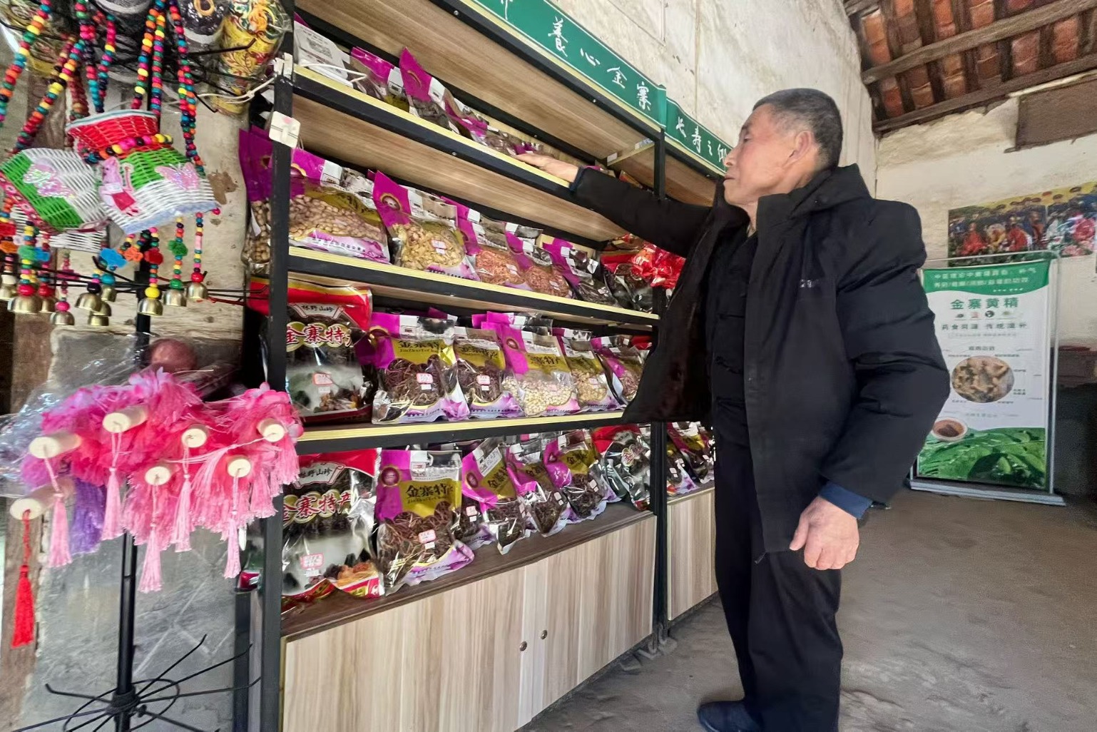 (图为陈泽申老人正在整理老宅内的农产品货架。邹臻杰/摄)