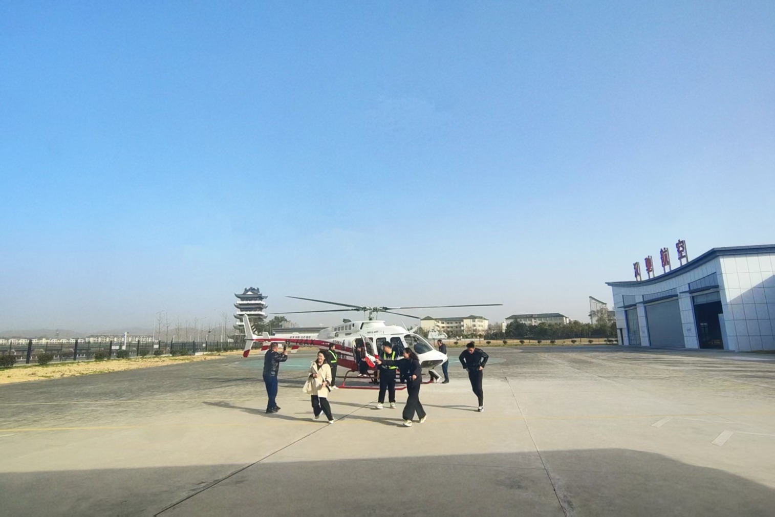除了“航行”,也有“飞行”,紧挨着金寨县的霍山县,一架贝尔407直升机正在缓缓降落。