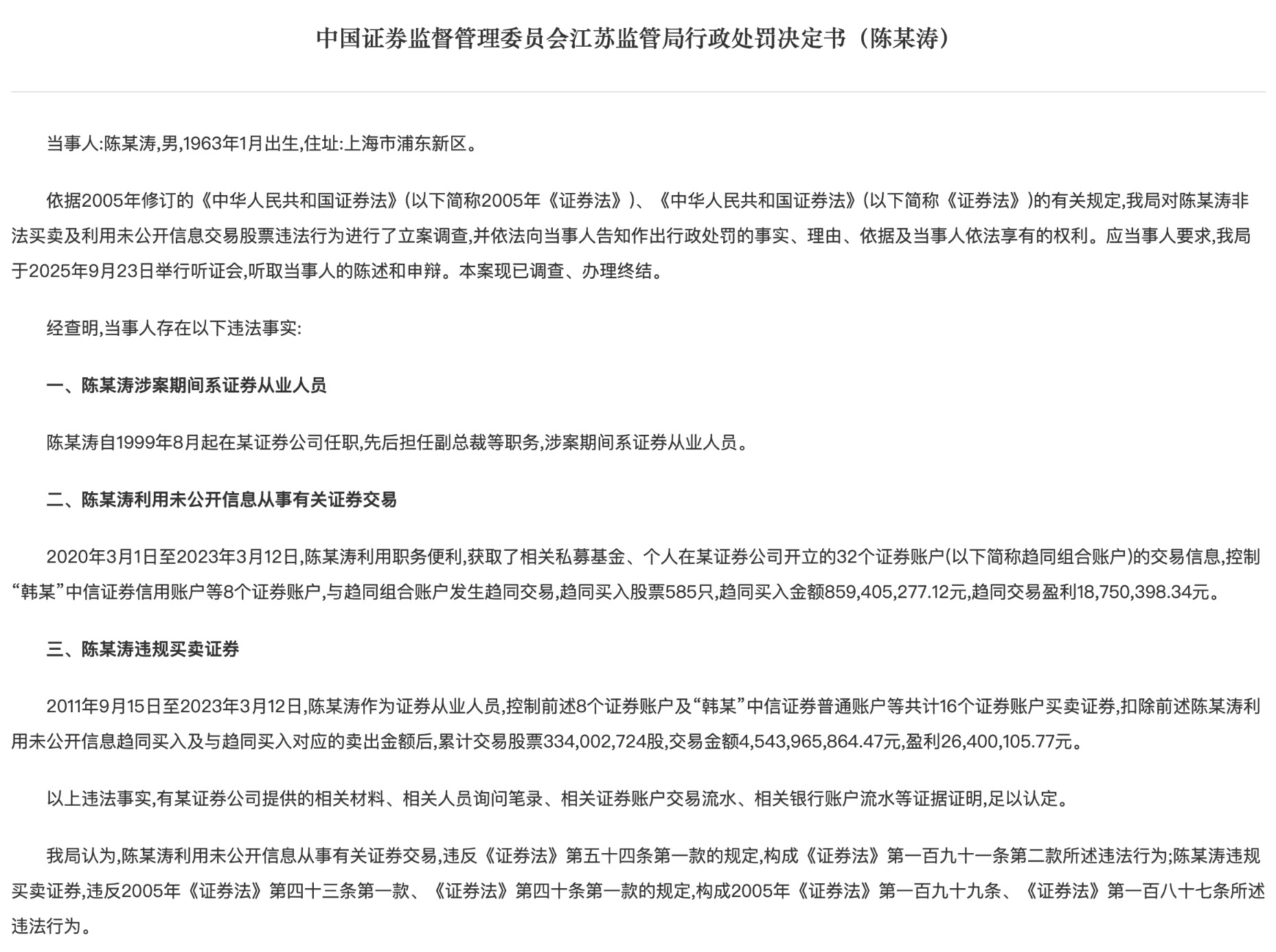 江苏证监局日前披露的一则行政处罚决定书,揭开了某券商副总裁陈某涛多年的违法违规行为。其利用未公开信息从事证券交易、违规买卖证券,被江苏证监局没收违法所得4515.05万元,并处以9030.1万元罚款,合计罚没款高达1.35亿元。