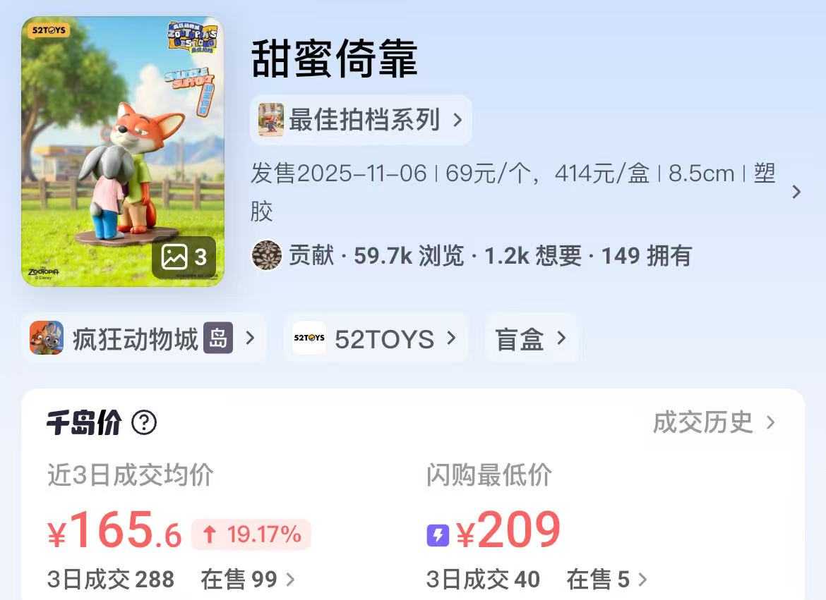 在联名中泡泡玛特与TOP TOY均推出角色盲盒,热门款均在二手交易平台出现不同程度的溢价。蓝鲸记者从千岛APP查询发现,“最佳拍档”系列中官方单价69元的“甜蜜倚靠”款近3日成交价已高达165元,较原价溢价近百元。