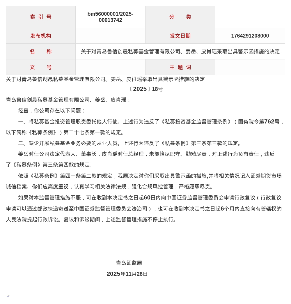 青岛鲁信创晟私募被出具警示函,涉委托他人行使投资管理职责等