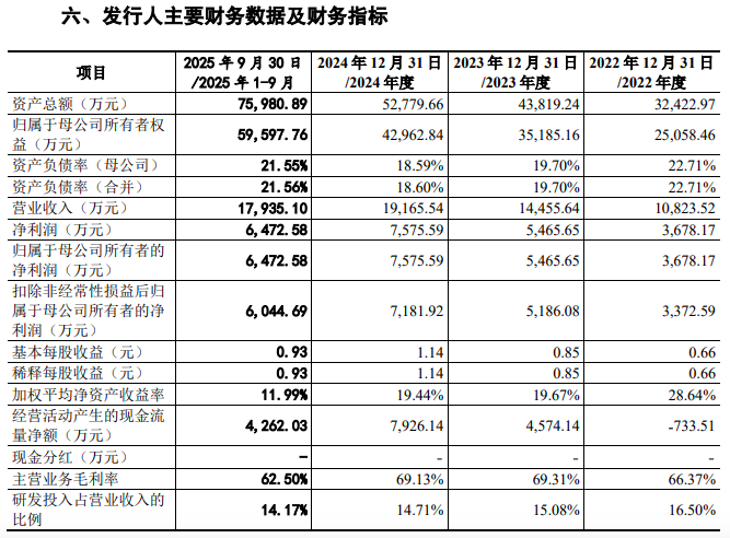 业绩方面,据最新披露的招股书,2022年至2025年1-9月(简称报告期),公司营业收入分别为10,823.52 万元、14,455.64万元、19,165.27 万元和 17,866.06 万元,