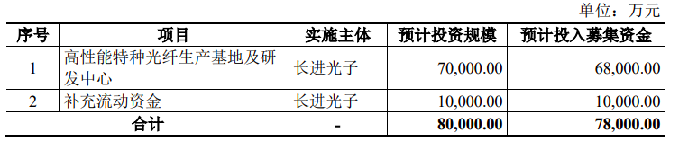 此次IPO,长进光子计划募资7.8亿元,其中6.8亿元用于高性能特种光纤生产基地及研发中心,1亿元用于补充流动资金。