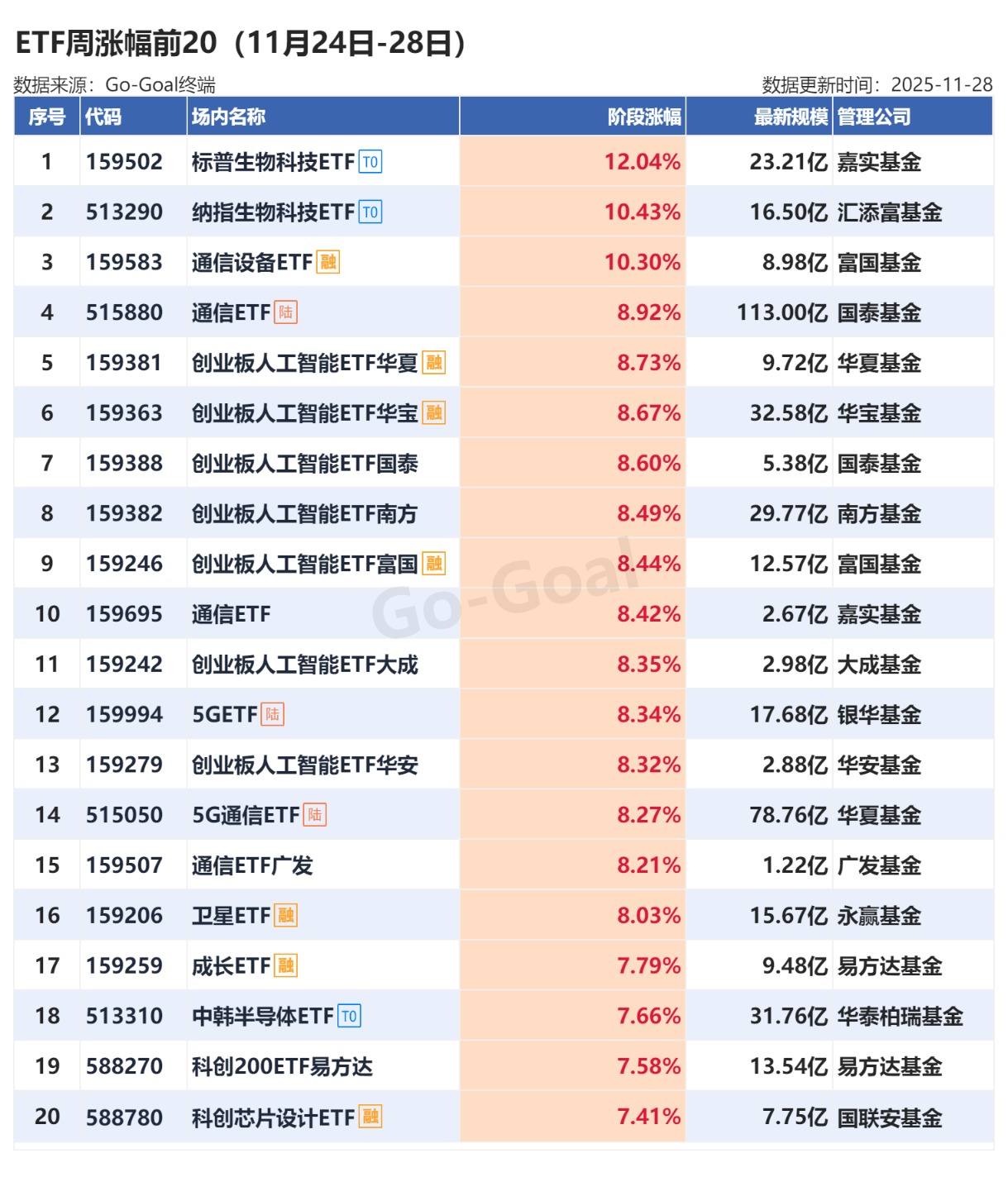 上证报中国证券网讯(记者汪友若)本周,A股市场三大指数全线上涨,其中创业板指表现最为强劲,周涨幅达4.54%,深证成指和上证指数分别上涨3.56%和1.40%。Go-Goal ETF数据显示,本周生物科技类ETF表现突出,标普生物科技ETF和纳指生物科技ETF等多支产品周涨幅超10%,通信和人工智能相关ETF同样涨幅居前。跌幅方面,能源、交运、地产相关ETF品种跌幅居前。