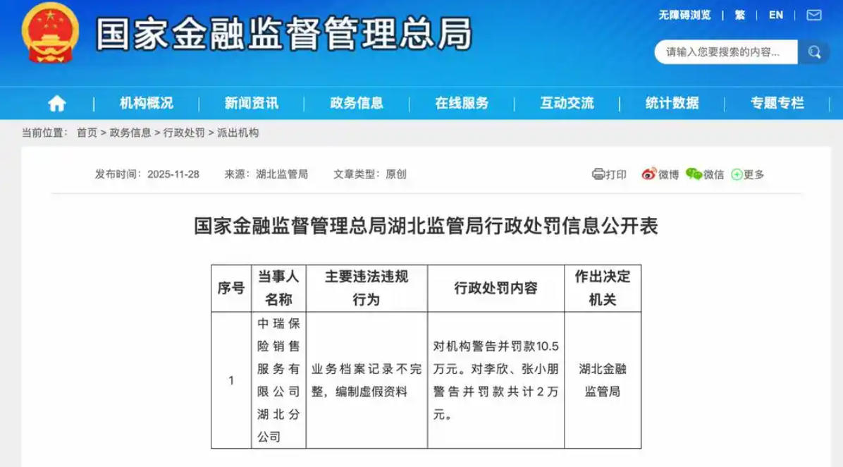 11月28日,湖北金融监管局发布的行政处罚信息显示,中瑞保险销售服务有限公司湖北分公司存在业务档案记录不完整,编制虚假资料的违法违规行为。湖北金融监管局对机构警告并罚款10.5万元。对李欣、张小朋警告并罚款共计2万元。