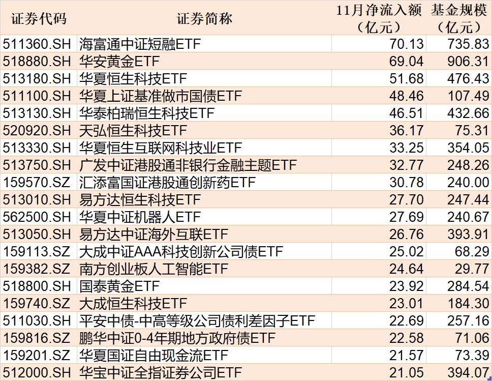 截至11月28日,11月资金净流入额居前20的ETF名单如下: