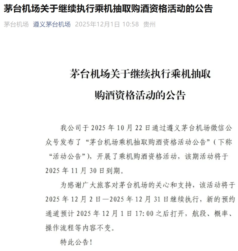 每经AI快讯,12月1日,茅台机场官微公告,“乘机抽取购酒资格活动”将于12月2日至12月31日继续执行。