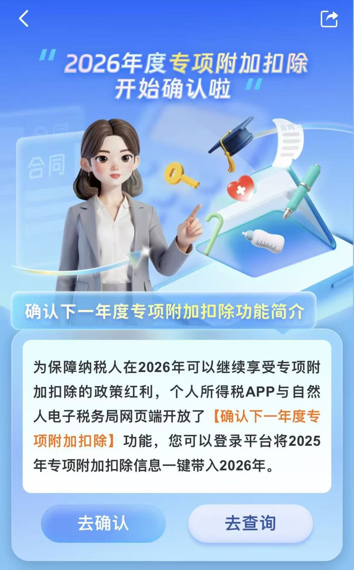 如果明年的专项附加扣除信息跟今年一致,那么可以在个税APP页面中点击“确认下一年度专项附加扣除一键带入”,确认之后,由此则直接将你今年填报的扣除信息一键带入到2026年继续使用。