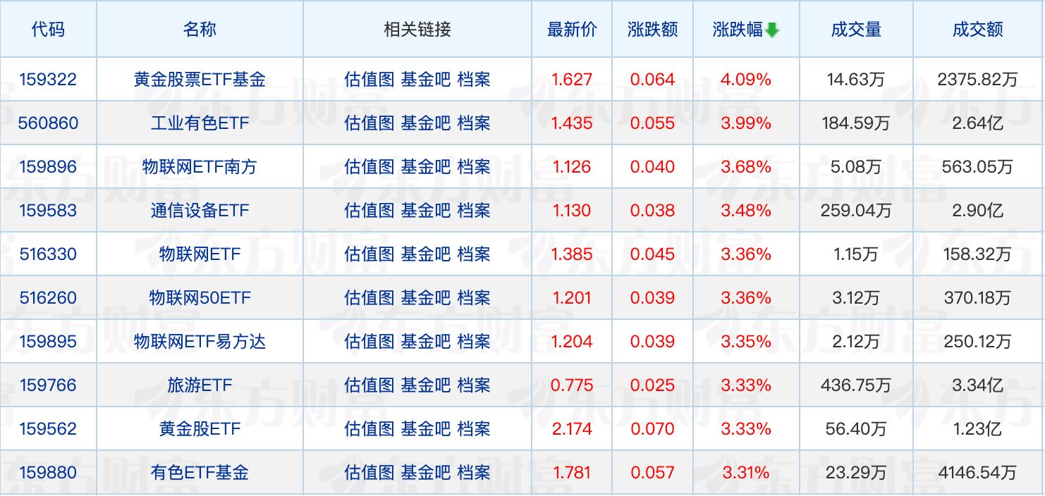 具体来看,黄金股票ETF基金领涨4.09%,多只物联网ETF走强。