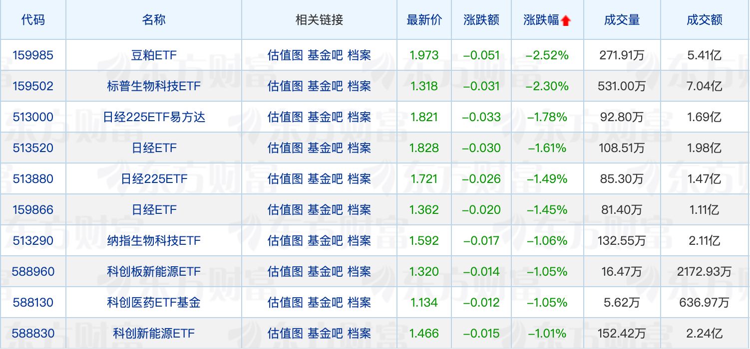 下跌方面,豆粕ETF领跌2.52%,日经225相关ETF悉数回调。