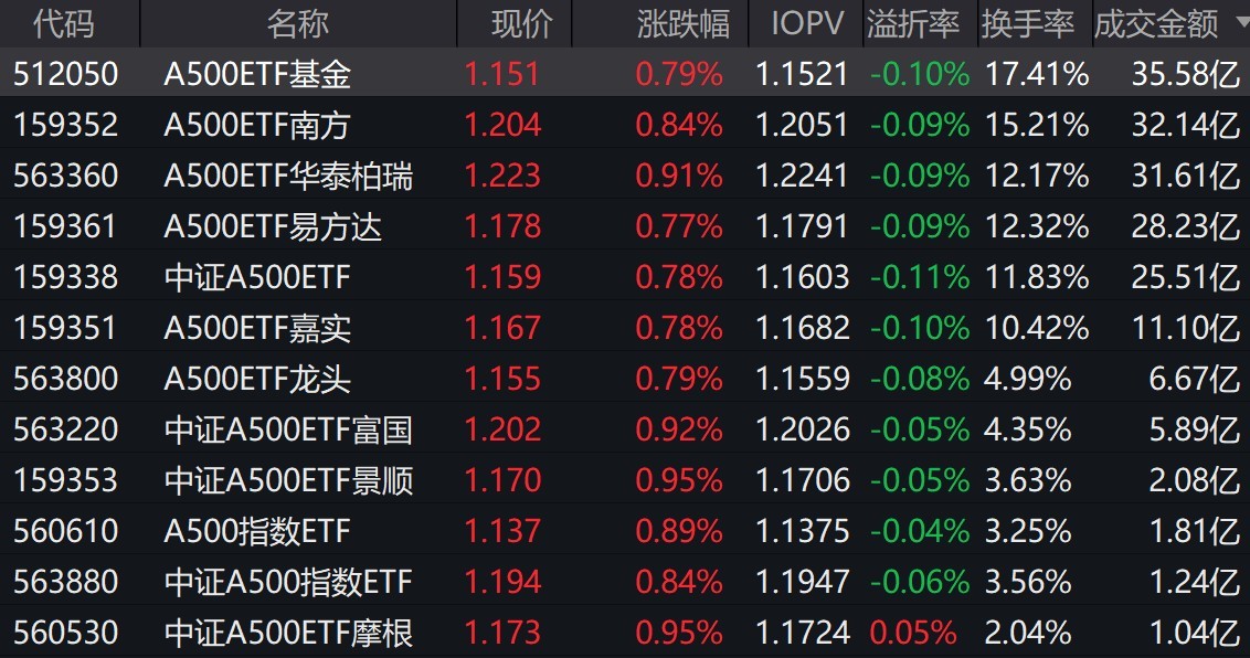 截至上午收盘,场内跟踪中证A500指数的ETF小幅上涨。其中,有12只中证A500相关ETF成交额超1亿元,3只超31亿元。A500ETF基金、A500ETF南方、A500ETF华泰柏瑞早盘成交额分别为35.58亿元、32.14亿元、31.61亿元。