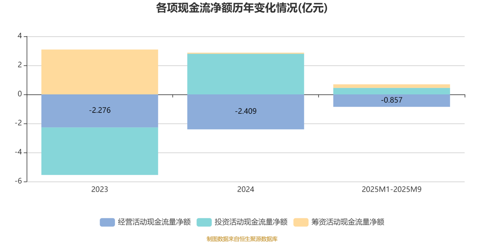 2025年1月至9月,公司经营活动现金流净额为-8567.7万元,同比增加1.31亿元;筹资活动现金流净额2462.3万元,同比增加1617.6万元;投资活动现金流净额4449.5万元,上年同期为2.79亿元。