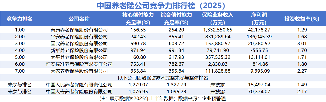 新华养老排名第四。2025 年上半年,其核心偿付能力充足率为 971.94%,综合偿付能力充足率为 991.34%,保险业务收入7.97 亿元,亏损0.06 亿元,投资收益率 1.7%。《报告》指出,尽管新华保险在2025年上半年出现小幅亏损,但其超高的偿付能力充足率反映了雄厚的资本缓冲,为未来业务扩张提供了坚实后盾。