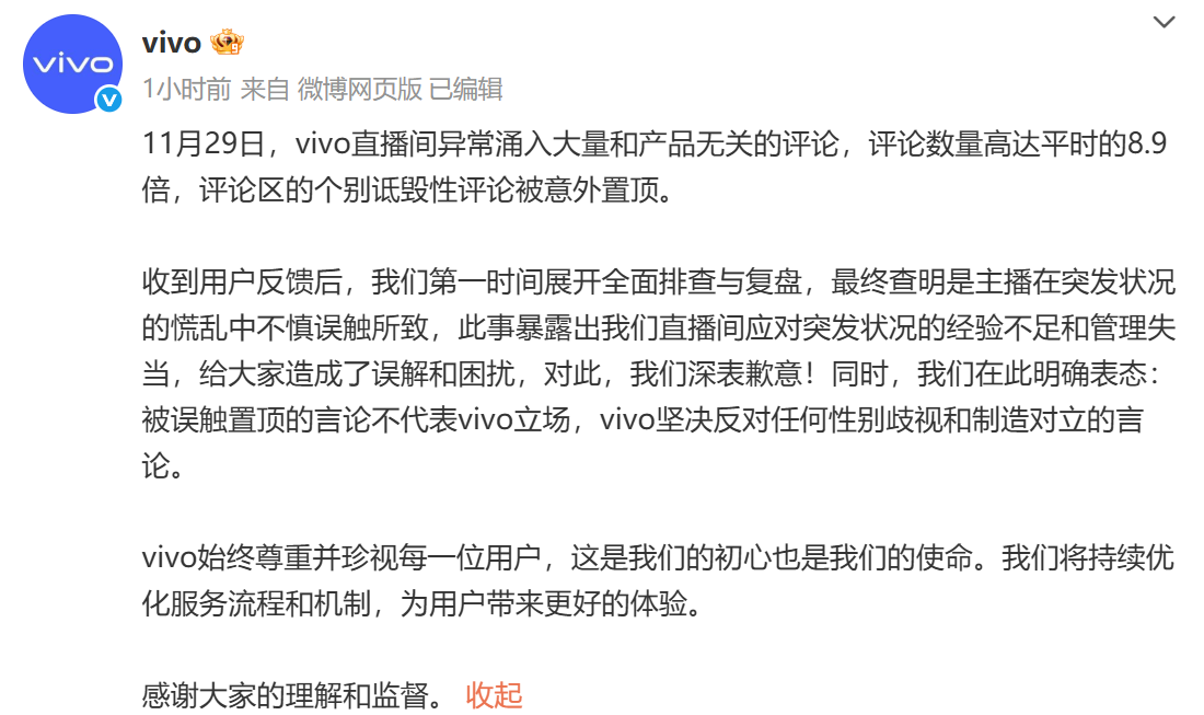 vivo表示,收到用户反馈后,该公司第一时间展开全面排查与复盘,最终判断是主播在突发状况的慌乱中不慎误触所致。此事暴露出我们直播间应对突发状况的经验不足和管理失当,给大家造成了误解和困扰,对此,我们深表歉意!同时,我们在此明确表态:被误触置顶的言论不代表vivo立场,vivo坚决反对任何性别歧视和制造对立的言论。