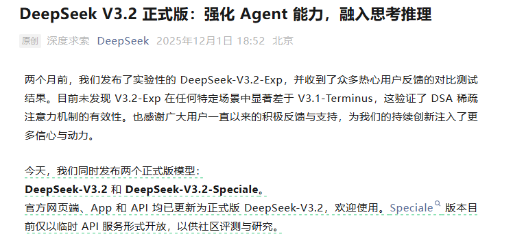 12月1日晚间,DeepSeek发布两个正式版模型:DeepSeek-V3.2 和 DeepSeek-V3.2-Speciale。
