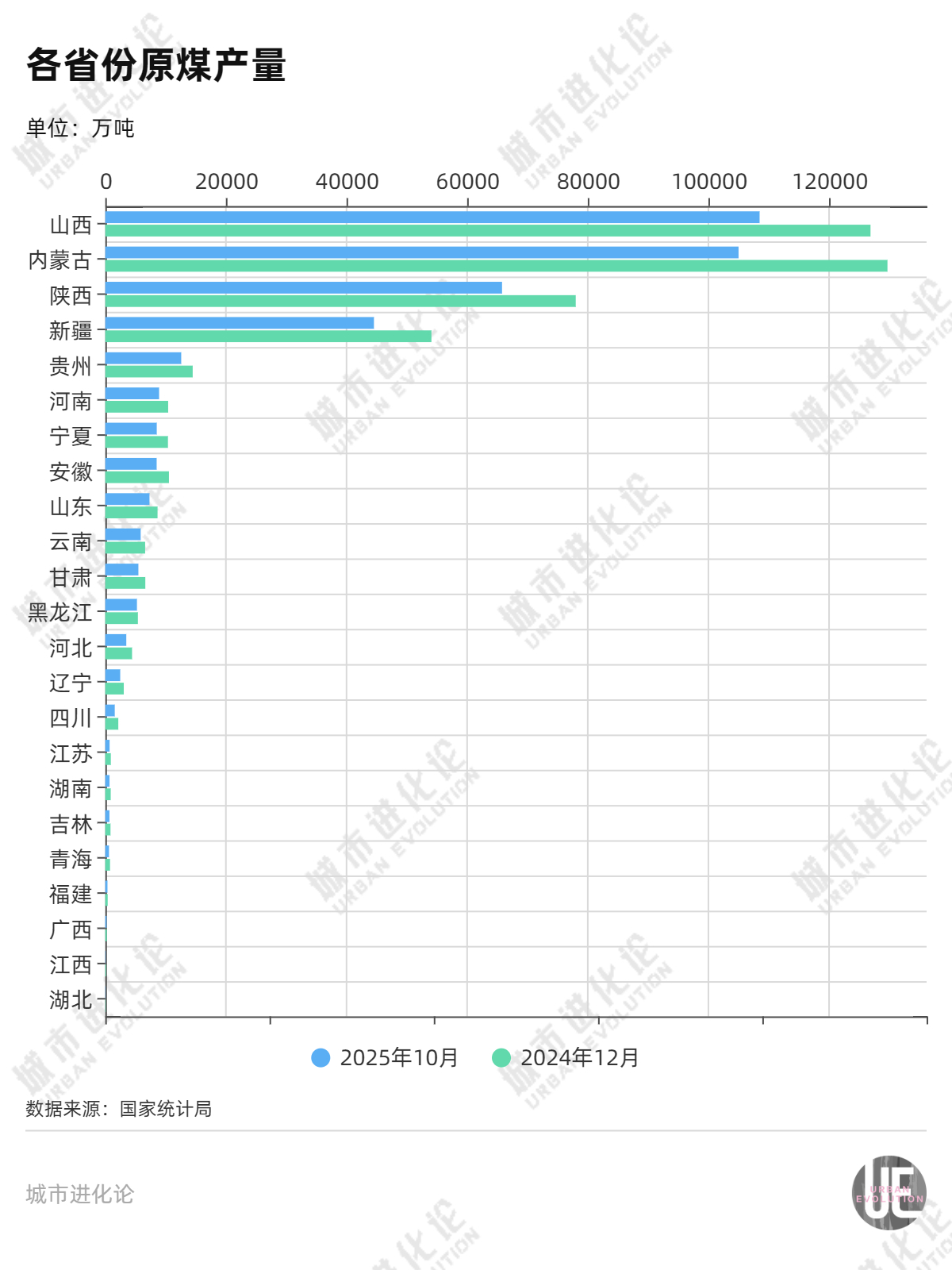 国家统计局最新数据显示,1—10月,内蒙古原煤产量104996.7万吨,山西原煤产量108485.8万吨,比内蒙古多出约3500万吨。这也意味着,今年山西有望重回第一。