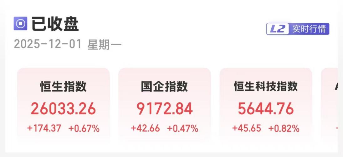 上证报中国证券网讯(卢伊记者严晓菲)12月1日,港股三大指数集体收涨。截至收盘,恒生指数涨0.67%,报26033.26点;恒生国企指数涨0.47%,报9172.84点;恒生科技指数涨0.82%,报5644.76点。