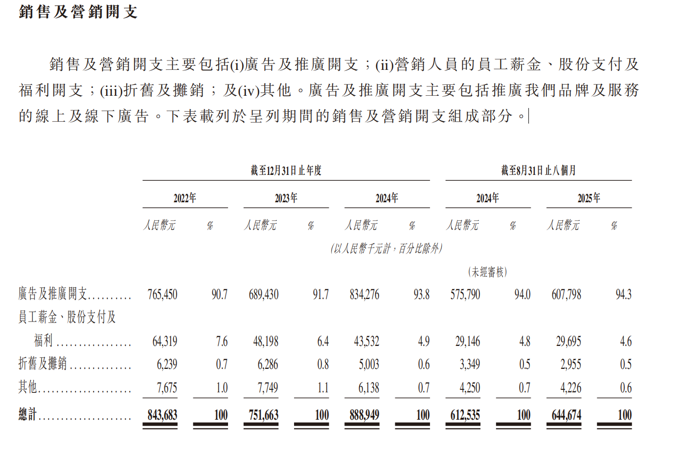 业内认为公司出现净亏损主要是因为在广告方面进行了高投入。招股书显示,Soul的销售及营销开支中,绝大多数用于广告及推广开支。2022年至2024年,公司支付的广告及推广开支分别为7.65亿元、6.89亿元、8.34亿元,2025年前八个月为6.08亿元。也就是说,三年多来Soul在广告和推广上,支付了接近29亿元。招股书还表示,包括推广、投研开支在内,公司成本及开支日后将会随着其扩大用户群及增加用户参与度,以及发展及实施更复杂的新功能及服务而继续增加。