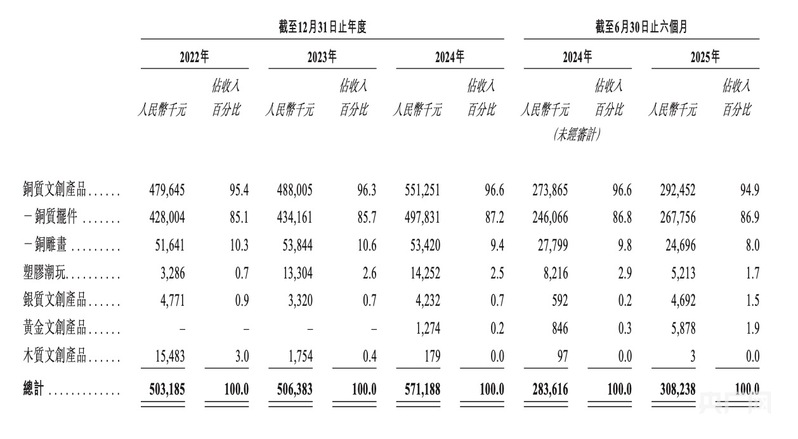 值得注意的是,2024年净利润同比激增79%。从产品结构来看,铜师傅的收入高度依赖铜质文创产品。2022年至2024年,铜质文创产品销售收入分别为4.80亿元、4.88亿元和5.51亿元,占同期总收入的95.4%、96.3%及96.6%。