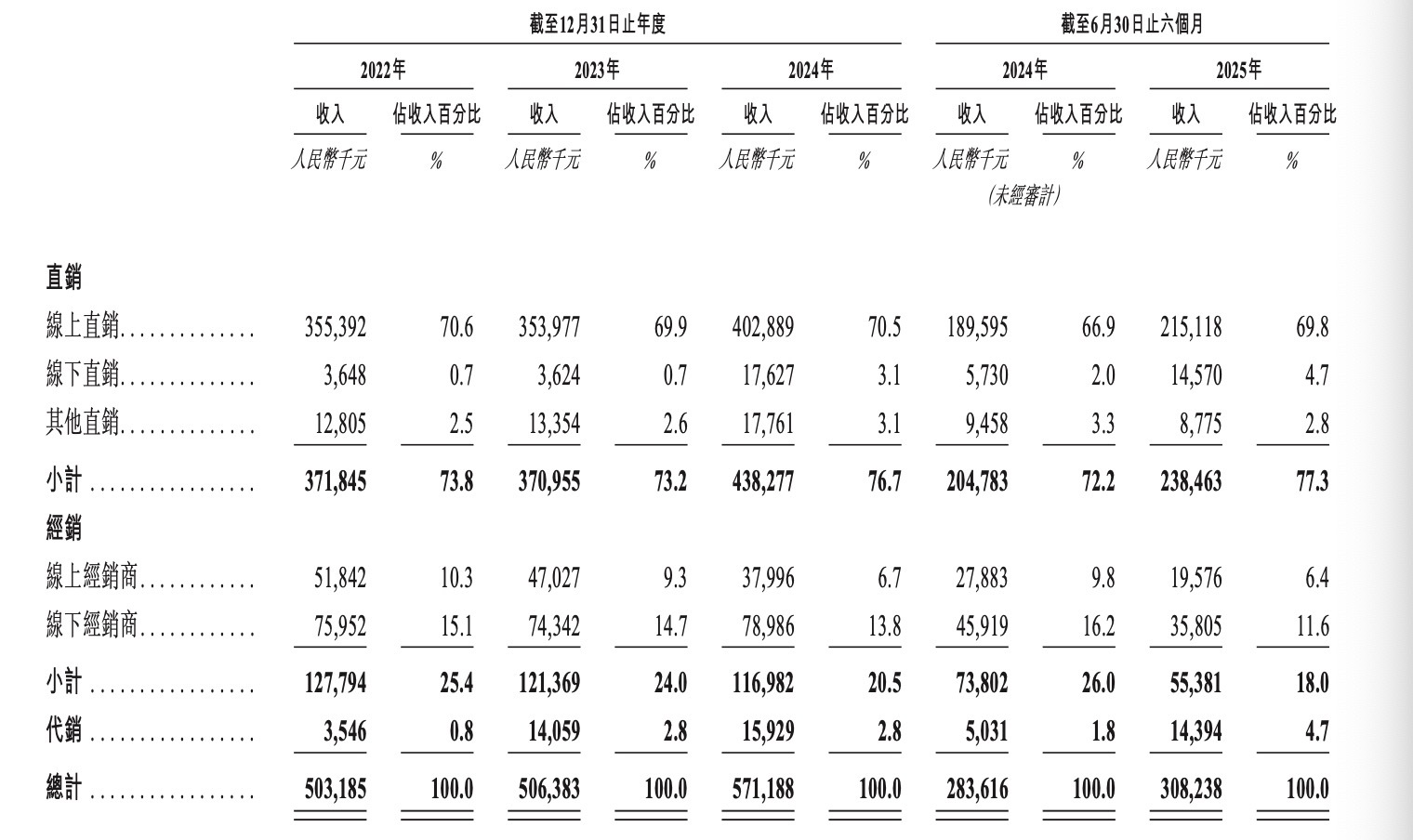 销售渠道集中也是公司的一大风险。招股说明书显示,杭州铜师傅在中国的大部分收入来自线上销售,尤其是通过一系列集中的第三方电商平台实现。2022至2024年以及2025上半年,公司的线上直销(主要来自天猫、京东、抖音等旗舰店)分别占总收入的70.6%、69.9%、70.5%及69.8%。叠加线上经销商销售,线上渠道收入占同期总收入的80.9%、79.2%、77.2%及76.2%。可以看出,杭州铜师傅的线上直销和线上经销渠道为公司贡献了70%以上的收入,凸显了公司对数字平台的高度依赖。