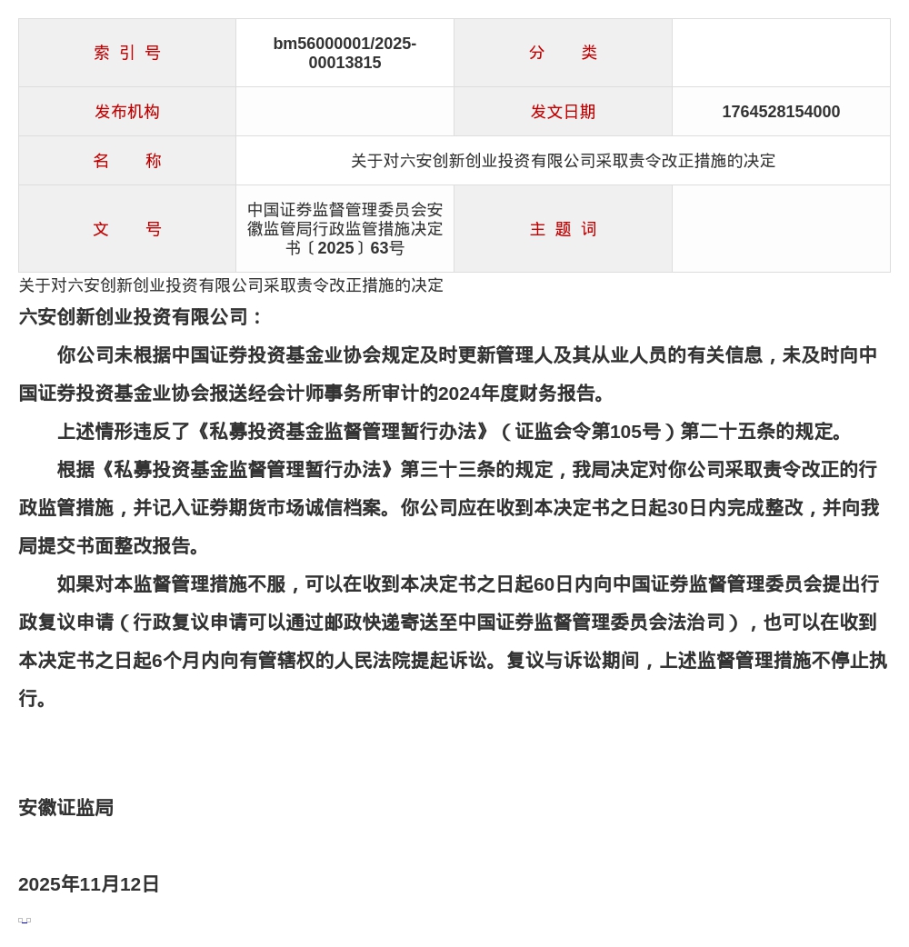 蓝鲸新闻12月1日讯,近日,安徽证监局发布了一则行政监管措施决定书,剑指六安创新创业投资有限公司。