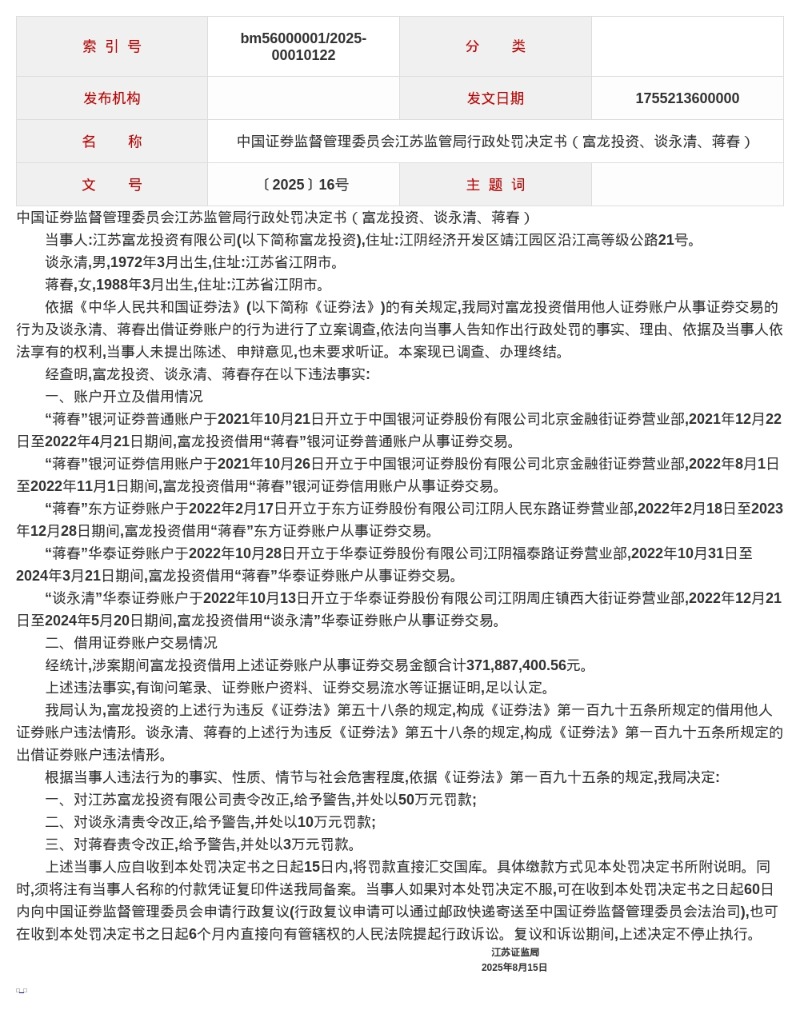 江苏富龙投资被罚50万,涉借用他人证券账户从事交易