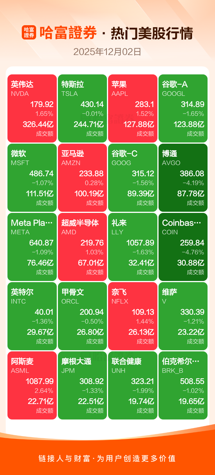 英伟达涨1.65%,特斯拉跌0.01%,苹果涨1.52%,谷歌-A跌1.65%,微软跌1.07%,亚马逊涨0.28%,谷歌-C跌1.56%,博通跌4.19%,Meta Platforms Inc-A跌1.09%,超威半导体涨1.03%。