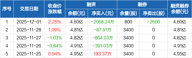 融资方面,当日融资买入2889.24万元,融资偿还4957.49万元,融资净偿还2068.24万元,连续4日净偿还累计3411.22万元。融券方面,融券卖出0股,融券偿还2600股,融券余量800股,融券余额1.75万元。融资融券余额合计4.6亿元。