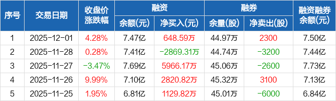 融资方面,当日融资买入1.7亿元,融资偿还1.63亿元,融资净买入648.59万元。融券方面,融券卖出2.03万股,融券偿还1.8万股,融券余量44.97万股,融券余额339.97万元。融资融券余额合计7.5亿元。