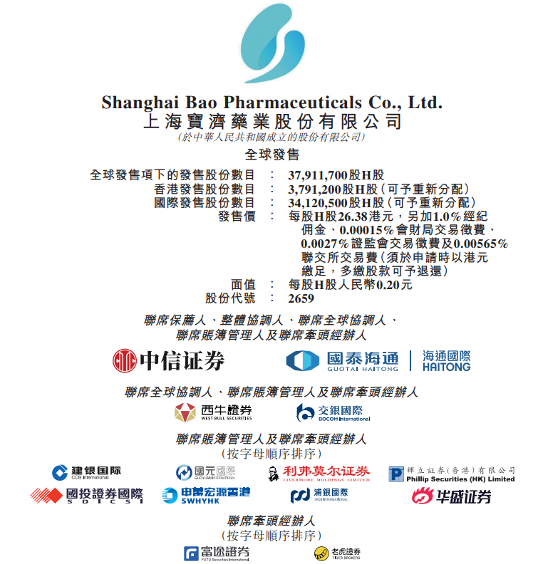 宝济药业-B(02659)于12月2日至12月5日招股,拟全球发售3791.17万股,其中香港发售占10%,国际发售占90%。最高公开发售价为每股26.38港元,每手100股,入场费约2664港元,预期股份将于12月10日在香港联交所开始买卖。