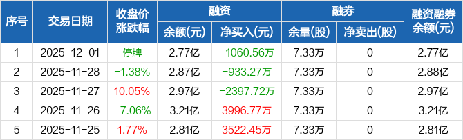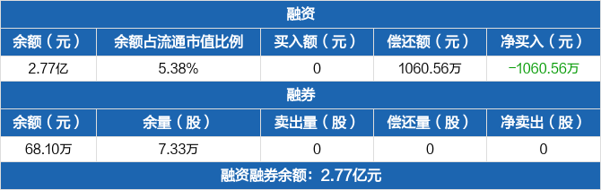 融资方面,当日融资买入0元,融资偿还1060.56万元,融资净偿还1060.56万元,连续3日净偿还累计4391.55万元。融券方面,融券卖出0股,融券偿还0股,融券余量7.33万股,融券余额68.1万元。融资融券余额合计2.77亿元。