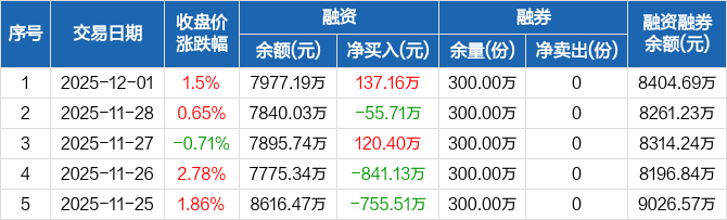 创业50ETF:融资净买入137.16万元,融资余额7977.19万元(12-01)