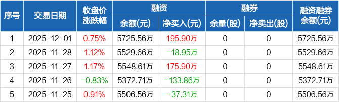 锡南科技:融资净买入195.9万元,融资余额5725.56万元(12-01)